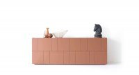 Het Ortelia dressoir is voorzien van een "betegeld" front met een speelse, grafische uitstraling die dynamiek brengt in het oppervlak, dat bestaat uit vierkante delen die scharnierende deuren en laden verbergen. Het is een elegant en toch minimalistisch stuk, verkrijgbaar in twee maten en met een matte of glanzend gelakte afwerking. De buitenste laklaag is aan de binnenkant op elkaar afgestemd, waardoor de esthetische continuïteit wordt gewaarborgd en de nauwgezette aandacht voor details, die zo synoniem is met Lema, tot uiting komt.