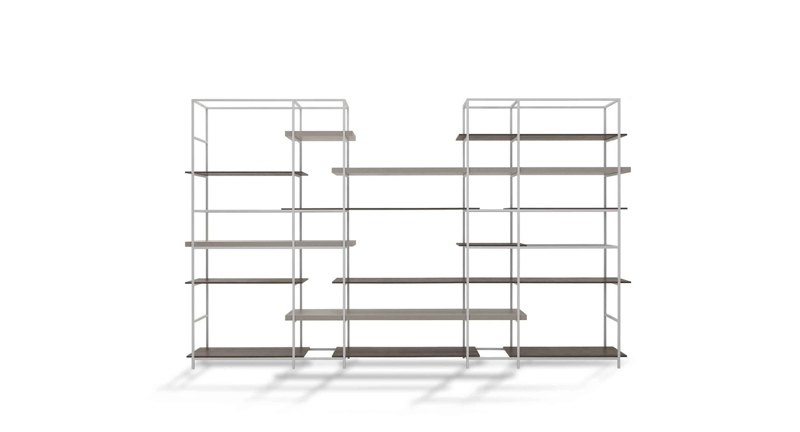 Plain, de vrijdenkende, vrijstaande boekenkast. De architectonische benadering achter Plain is een creatief idee dat gericht is op vloeibaarheid en lichtheid. Deze vrijstaande boekenkast bevat veel van de ontwerpkenmerken die synoniem zijn met Lema, niet in de laatste plaats modulariteit en maatwerk in zowel de samenstelling als de afwerking. De strakke structuur in gelakt metaal met vierkante doorsneden biedt plaats aan de planken, die in verschillende lengtes en diktes verkrijgbaar zijn. In een schijnbaar willekeurige volgorde gerangschikt binnen een structuur die bijna opgaat in zijn omgeving, creƫren de rekken compartimenten voor het opbergen van boeken en objecten van verschillende hoogtes, wat een aantrekkelijk gevoel van dynamiek aan de wand geeft. Met eindeloze compositorische mogelijkheden is de Plain boekenkast een miniwerk van architectuur.