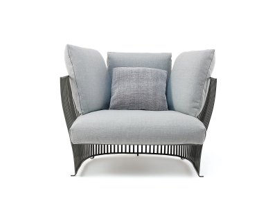 De elegantie van het stadsmeubilair van het einde van de negentiende eeuw herleeft in een project dat tijdloze charme en moderne functionaliteit combineert. De aluminium structuur die visueel herinnert aan de oude balustrades, kenmerkt de sofa's en de fauteuil, en omhult de royale en afgeronde vormen van de zitting met een gevoel van lichtheid en robuustheid tegelijk.