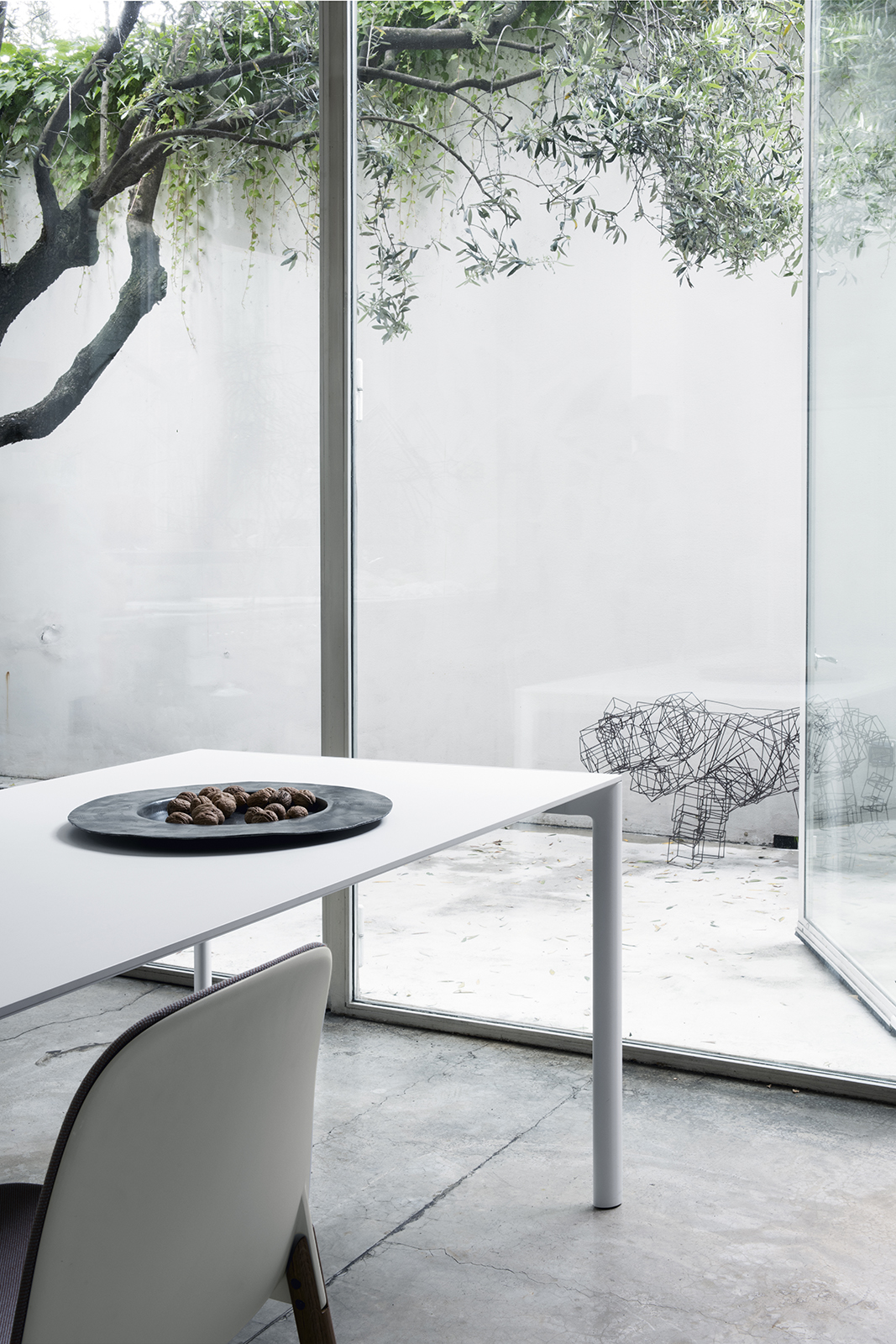 De poten van de Maki tafels hebben ronde vormen en zijn gecombineerd met een 20 cm breed en 2 cm dik tafelblad van teakhout met FSC-certificaat, dat milieuvriendelijk is. Het blad kan in zijn natuurlijke kleur worden gelaten, aangezien het in de loop der tijd een onmiskenbare zilverachtige tint krijgt, of het kan met olie worden behandeld om het zijn oorspronkelijke kleur terug te geven. De uittrekbare tafels zijn voorzien van getrokken aluminium verlengstukken, die in een speciaal vak zijn ondergebracht.